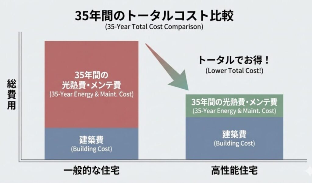 これを車に例えてみましょう。本体価格が安いけれど燃費が非常に悪い車と、本体価格は少し高いけれど燃費が抜群に良い車。35年間乗り続けるとしたら、どちらがお得でしょうか?答えは明白ですよね。実は、注文住宅もこれと全く同じです。