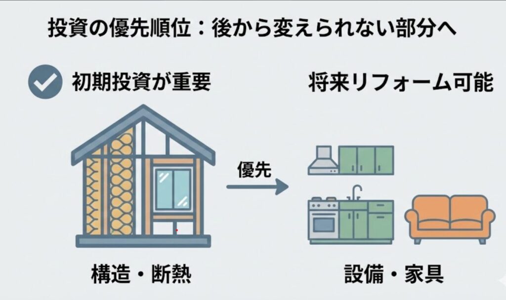 一度建ててしまった家の断熱材を後から入れ替えるのは、多大な費用がかかります。一方で、キッチンのグレードなどは15〜20年後のリフォーム時に検討することも可能です。「後から変えられない部分(構造・断熱)」にお金をかけ、「後から変えられる部分(設備)」で調整する。 これが、一級建築士がおすすめする、失敗しない資金計画の鉄則です。
